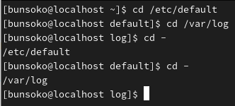 cd /etc/default # /etc/default に移動cd /var/log # /var/log に移動 cd - # 直前のディレクトリ(/etc/default)に戻る cd - # 再び直前のディレクトリ(/var/log)に戻る