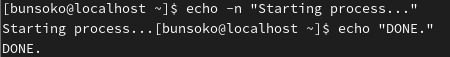 意味: 通常、echoコマンドは出力の最後に改行コード(\n)を付けますが、このオプションを付けると改行されません。プロンプトと同じ行に続けて入力を促したい場合などに便利です。