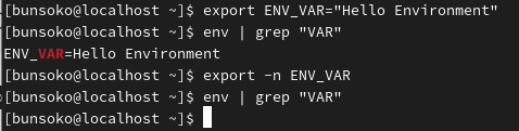※export -n ENV_VARのあとにenvコマンドを使用した確認で表示されなくなりました。