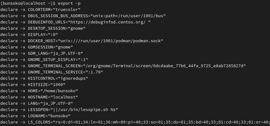 • 引数を付けずにexportと入力すると、現在エクスポート(公開)されている全ての環境変数が一覧表示されます。
