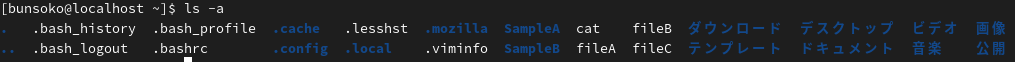 lsと入力すると、現在の作業ディレクトリにある非表示ではないファイルとディレクトリの一覧が表示されます。