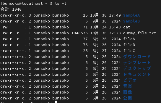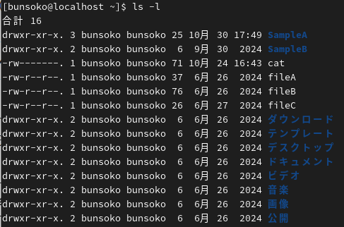 -lの出力における最初の10文字(ファイルタイプと権限)の構造を理解すること(例:dはディレクトリ、-は通常ファイル、lはシンボリックリンク)。 - 複数オプションの結合: オプションはまとめて記述できること(例: