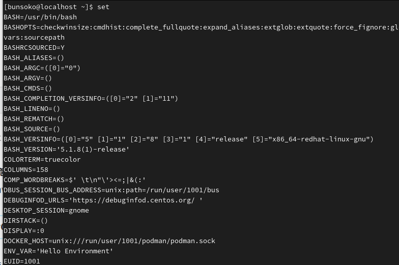注意: envコマンドは環境変数のみを表示するのに対し、setコマンドはローカル変数を含む全てを表示するため、通常はenvの出力よりも遥かに多くなります。
