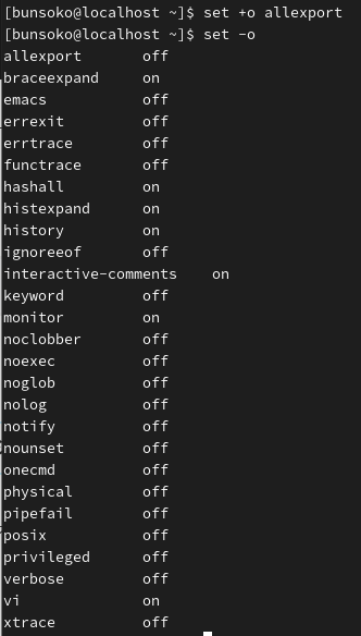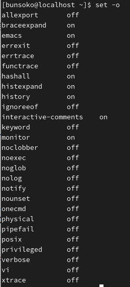 set -oまたはset +oを使うことで、シェルの動作に関するオプション(shoptコマンドでも設定可能)を操作できます。