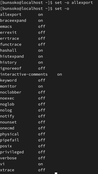 setと入力すると、現在シェルで設定されている全てのローカル変数と環境変数が一覧表示されます。 - 最も重要な使い方は、シェルオプションの有効化/無効化(例: