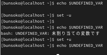 ※最初に未定義のUNDEFINED_VARをechoで出力した際は空白行として表示されましたが、set -uを実行後は「未割り当ての変数です」という表示がされるようになりました。また、set +uを実行することで設定を元に戻すことができます。