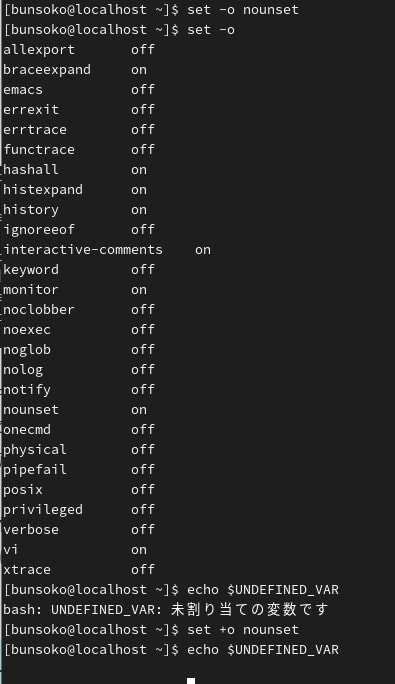 ちなみにこのset -uは、set -o nounsetと同様です。nounsetという項目の有効化/無効化を -u/+uで実行可能ということです。