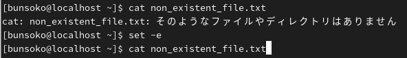 ※始めに存在しないファイル(non_existent_file.txt)をcatコマンドで表示しようとした際は存在しない旨の文章が表示されましたが、set -e後に同様のコマンドを実行すると、同様の文章は表示されずにプロンプトが閉じられます。(スクショの最後の行を実行後、自動で閉じられてしまいます。)