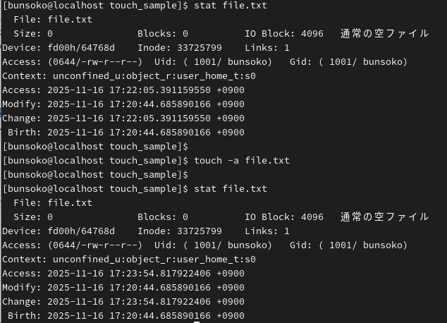 stat file.txt #touch -a実行後のファイルアクセス日時を確認