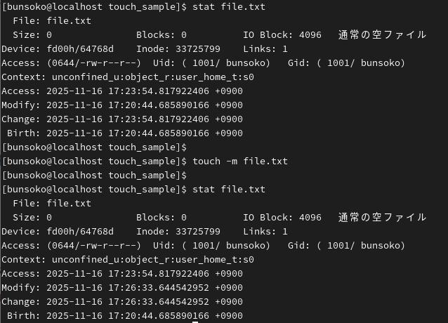 stat file.txt #touch -m実行後の最終更新日時を確認