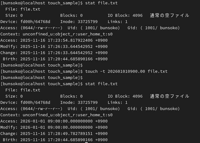 stat file.txt #touch -t実行後の最終アクセス日時、最終更新日時を確認