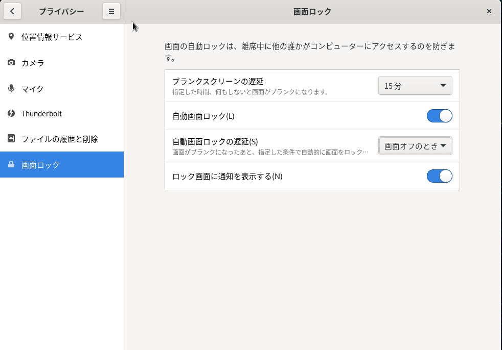 “自動画面ロックの遅延“では、画面がブランクになったあとに画面ロックするまでの時間を設定できます。